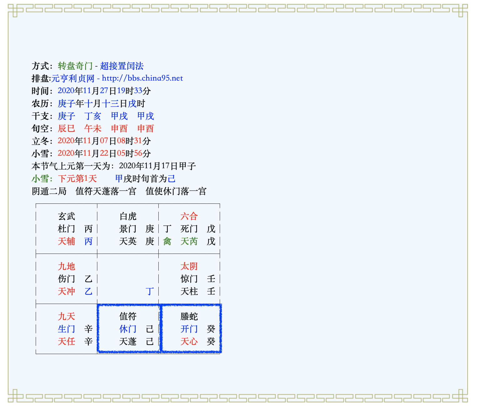 - Дворец Кунь с НС дня 庚 находится в состоянии "пустоты", что указывает на неуверенность человека в отношении предстоящего перевода на другую работу. Однако 庚 также является Тай Суй, более того, здесь же 值符, что символизирует близость к руководству или поддержку со стороны вышестоящих лиц.