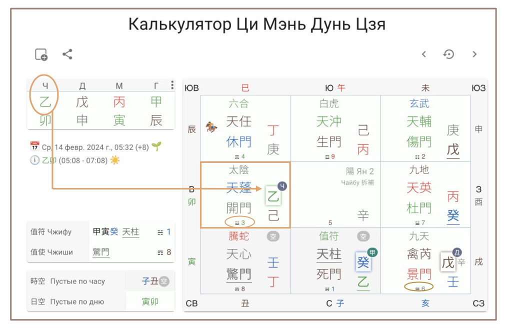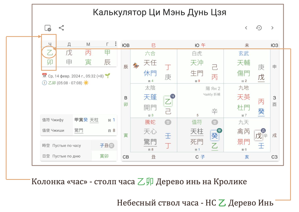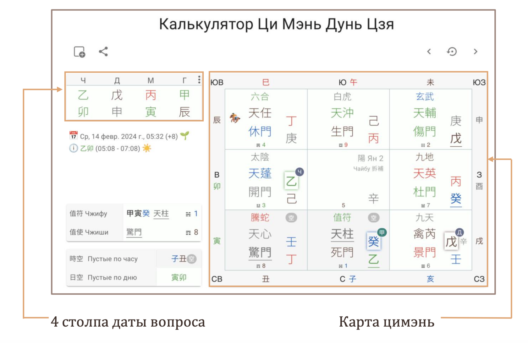 Пусть наш вопрос прозвучал 14 февраля 2024 года в 05:32 в г. Цзыбо, Китай. Построим часовую карту цимэнь с использованием калькулятора. Получим следующую карту часовую расклада цимэнь: