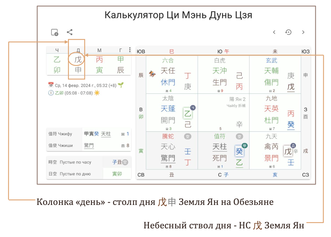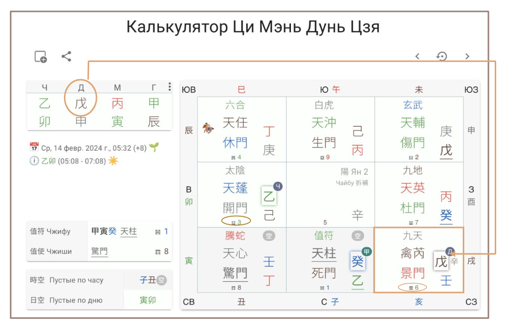 Шаг 2. В 4 столпах даты вопроса найдем колонку «день». Определим Небесный ствол дня (НС дня).