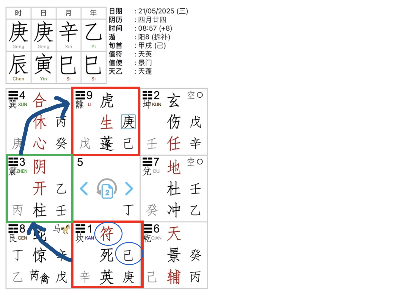 遁 (уход/сокрытие) есть стратегия, при которой могущественная, но уязвимая сила 甲 Цзя скрывается, чтобы избежать прямого столкновения и истощения. Она «прячется» в самых благоприятных секторах пространства и времени, которые вычисляются с помощью карты цимэнь.
