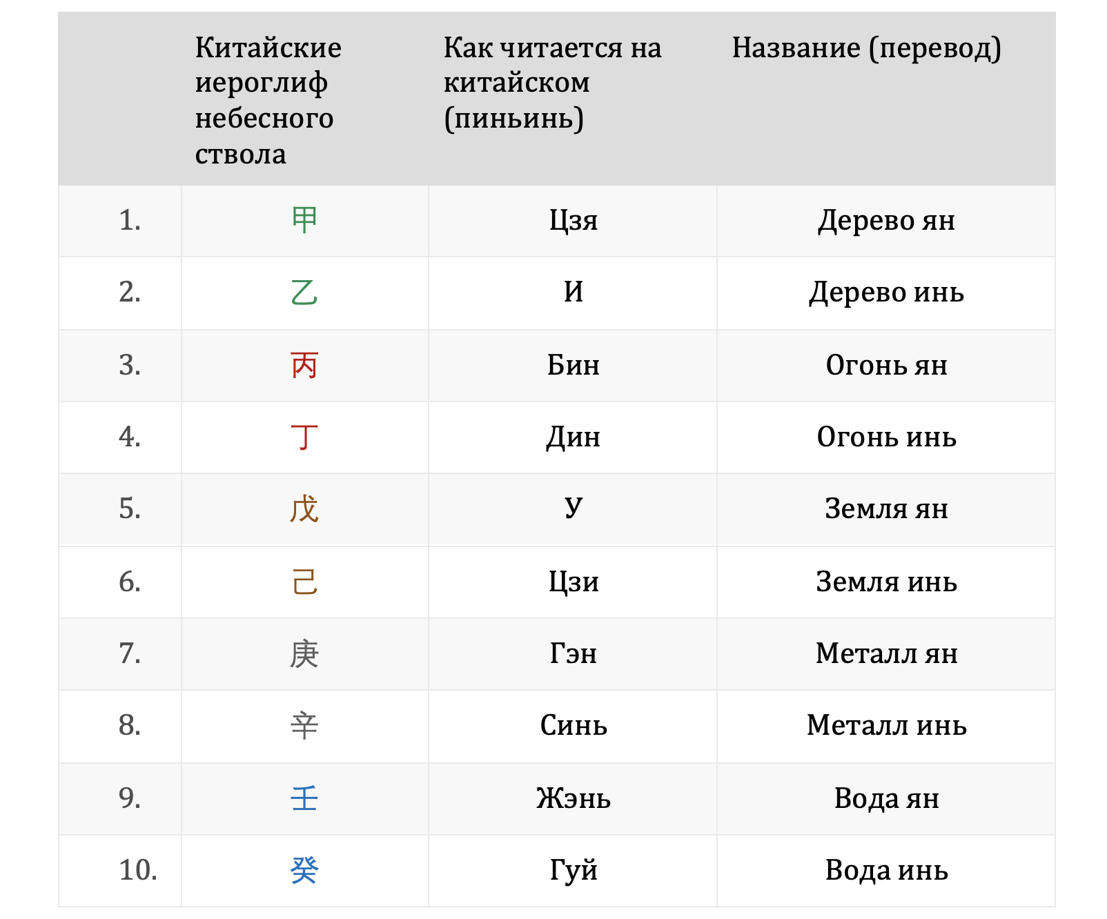 I. 10 небесных стволов: 甲, 乙, 丙, 丁, 戊, 己, 庚, 辛, 壬, 癸.