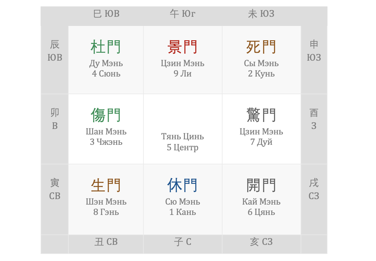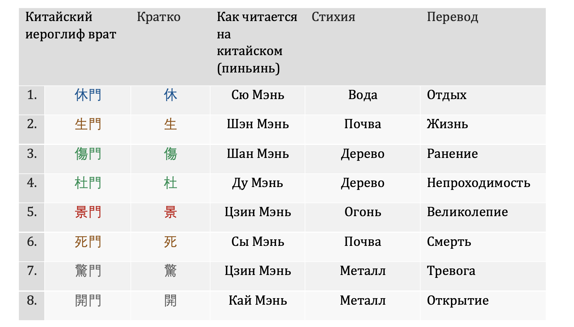 - Под иероглифом «门» Мэнь - 8 врат 休門, 生門, 傷門, 杜門, 景門, 死門, 驚門, 開門.
