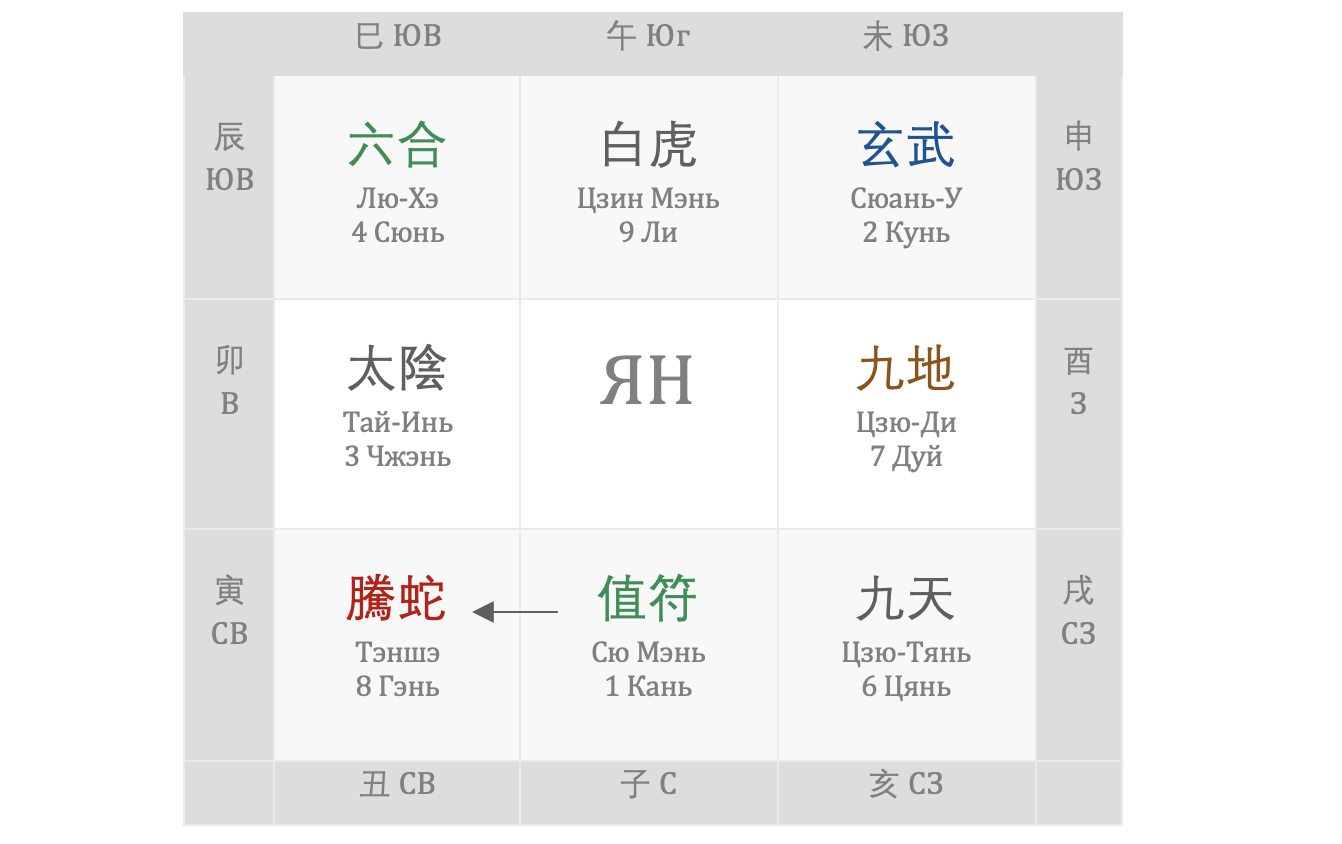 - В янских раскладах используется последовательность 符 → 蛇 → 陰 → 合 → 陳 → 雀 → 地 → 天 по кругу вперед (по часовой стрелке).