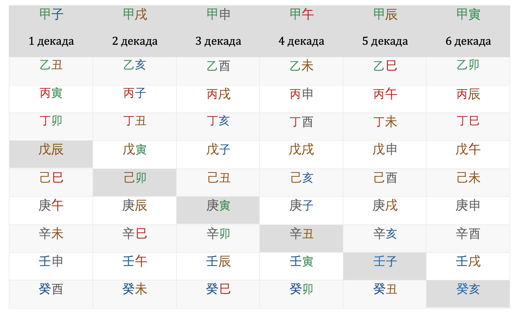 Таблица «Цикл Цзя Цзы и 6 инструментов декады»