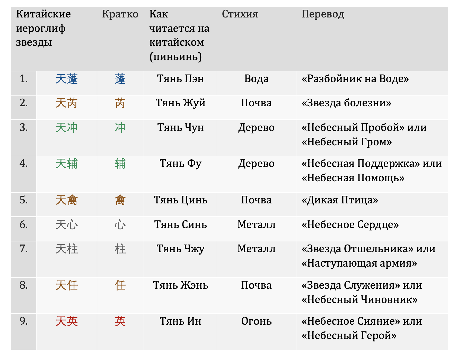 II. 9 звезд: 天蓬, 天芮, 天冲, 天辅, 天禽, 天心, 天柱, 天任, 天英.