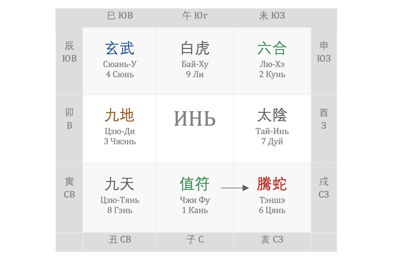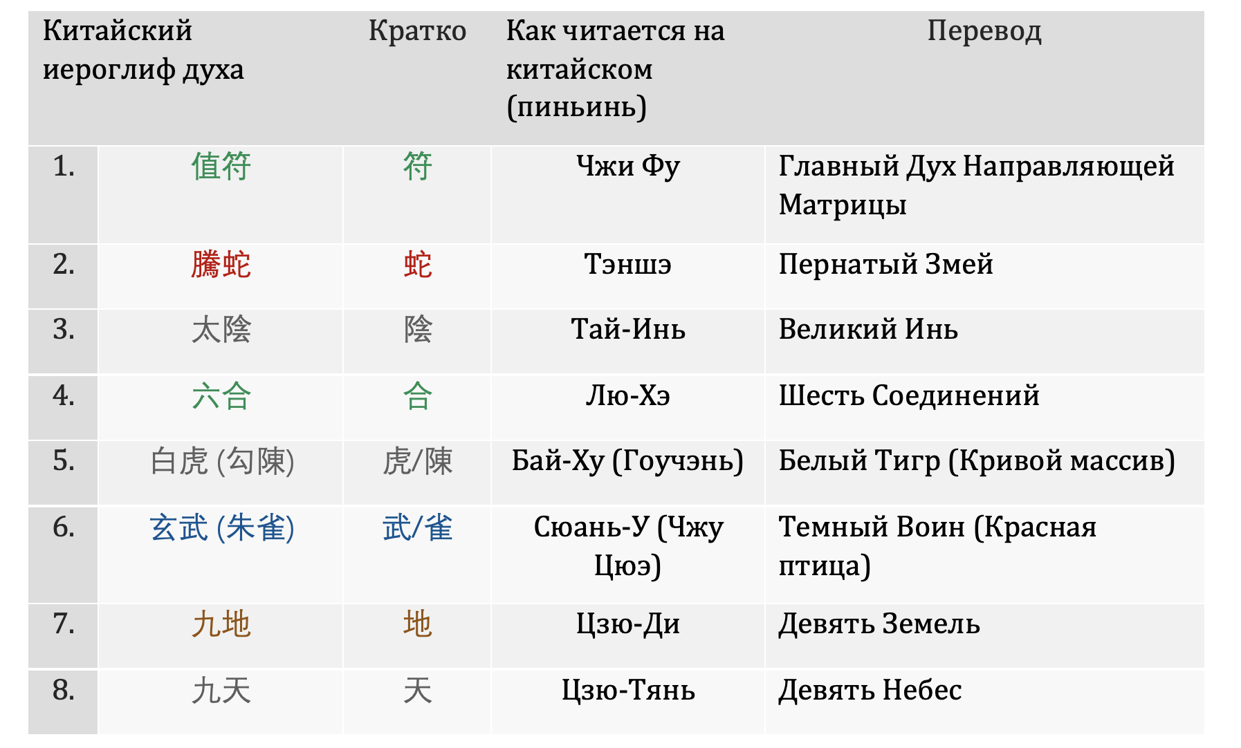IV. 8 духов: 值符, 騰蛇, 太陰, 六合, 白虎 (勾陳), 玄武 (朱雀), 九地, 九天.