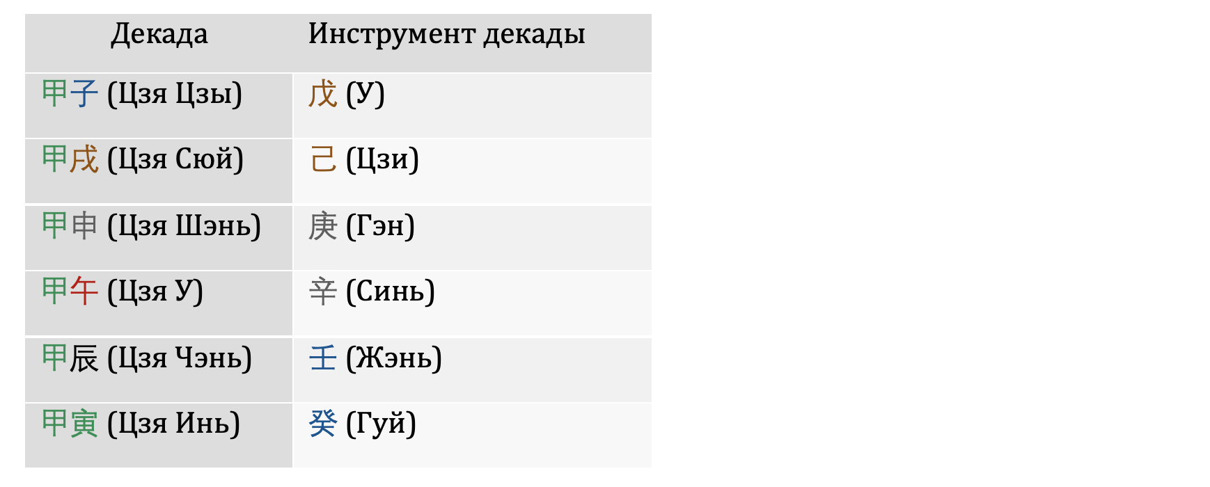 Каждой декаде соответствует свой Инструмент декады (义 И) – один из шести Небесных стволов: 戊, 己, 庚, 辛, 壬, 癸.