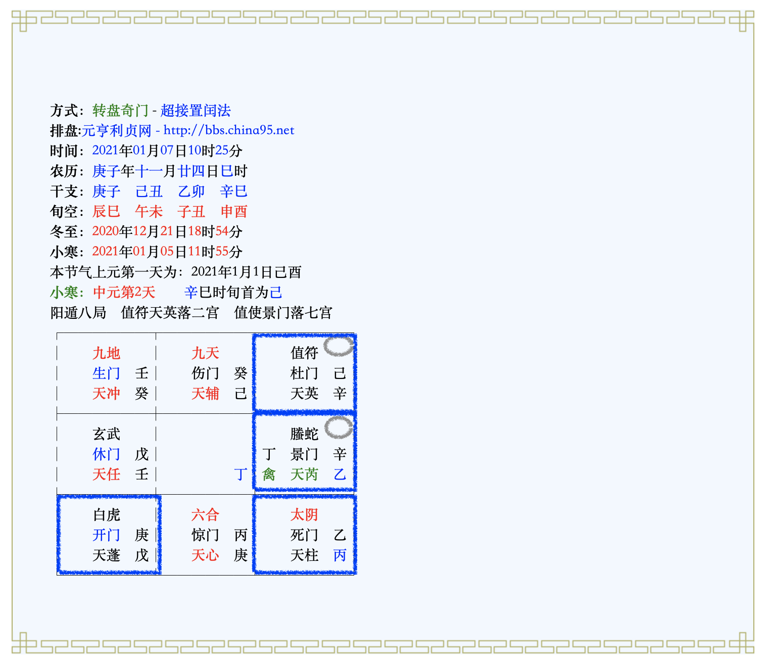 - НС дня 乙 в "Могиле" означает, что решение о тестировании не зависит от меня. НС часа 辛 с 天芮и 螣蛇 в Дуй указывает на COVID-19, но "Пустота" нейтрализует угрозу. Комбинация 辛 + 乙 потенциально опасна, но не реализуется. Дворец Дуй также содержит благоприятные факторы в этом плане.