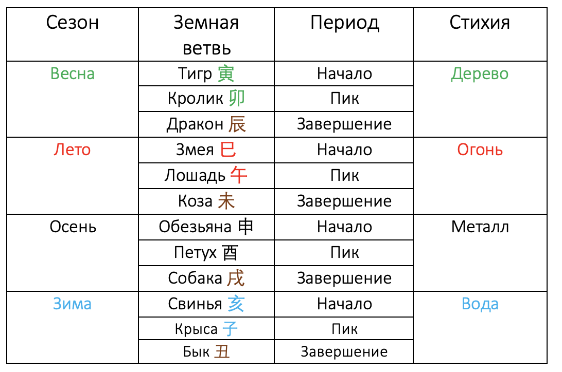 - Сезон Зимы образуют три Земные ветви: Свинья 亥 (ноябрь), Крыса 子 (декабрь), Бык 丑 (январь).