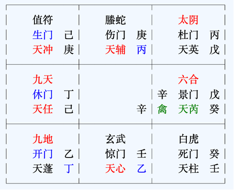 Небесный ствол часа 庚 во дворце Ли. Дворец с Небесным стволом дня 乙во дворце Гэнь. Дворец с Небесным стволом часа 庚 не контролирует дворец с Небесным стволом дня 乙.
