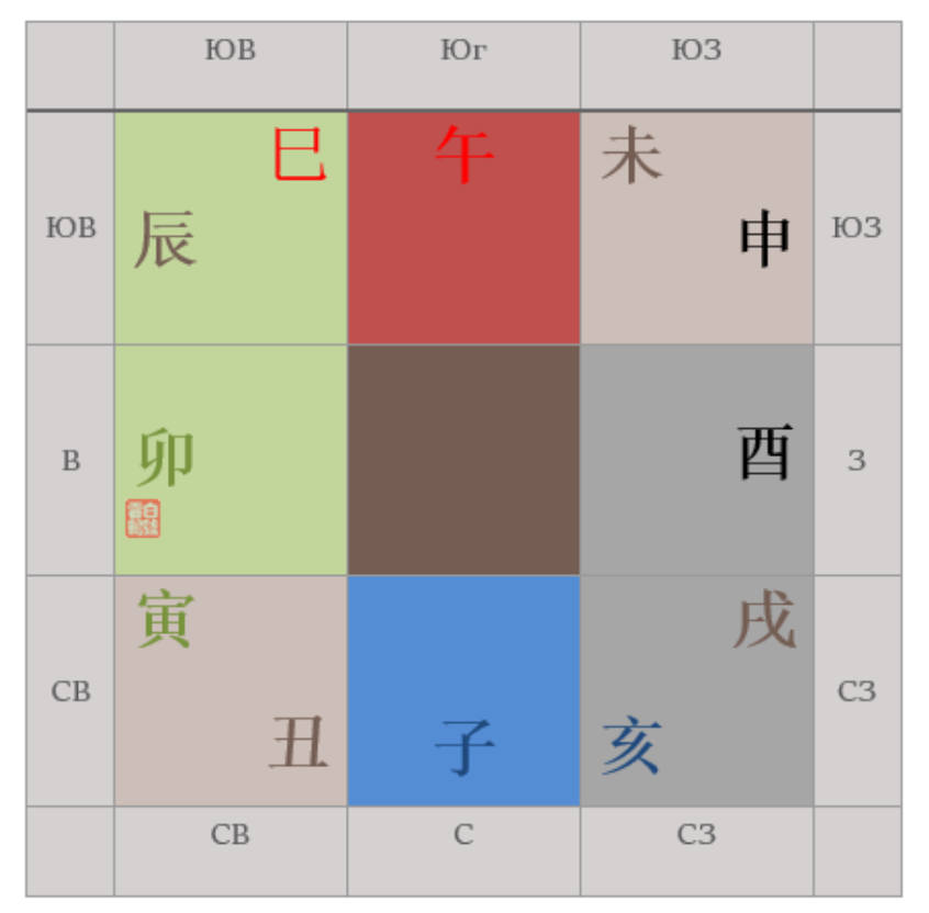 Если час будет попадать в декаду 甲午, то «пустыми» одновременно будут две ЗВ: 辰и 巳, расположенные в 4 дворце, поэтому 4 дворец «пустой» или говорят «технически пустой».