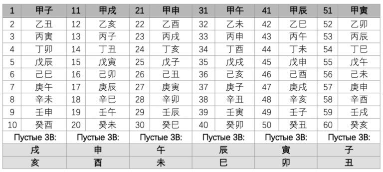 Например, рассмотрим 1 декаду 甲子. В первой декаде 10-ый столп — 癸酉. Если продолжить 1 декаду, закончив ее циклом 12 земных ветвей, т. е. Собакой 戌, затем 亥 Свиньей, то получится, что З В Собака 戌 и Свинья 亥 остались без Небесных стволов, т.к. небесных стволов всего 10, а земных ветвей 12. Отсюда, ЗВ 戌 и ЗВ 亥 оказываются «пустыми» для декады 甲子. То же самое происходит и в других декадах. Во 2-ой декаде «пустыми» ЗВ оказываются 申 и 酉, в 3-ей декаде — ЗВ 午 и 未 и т. д.