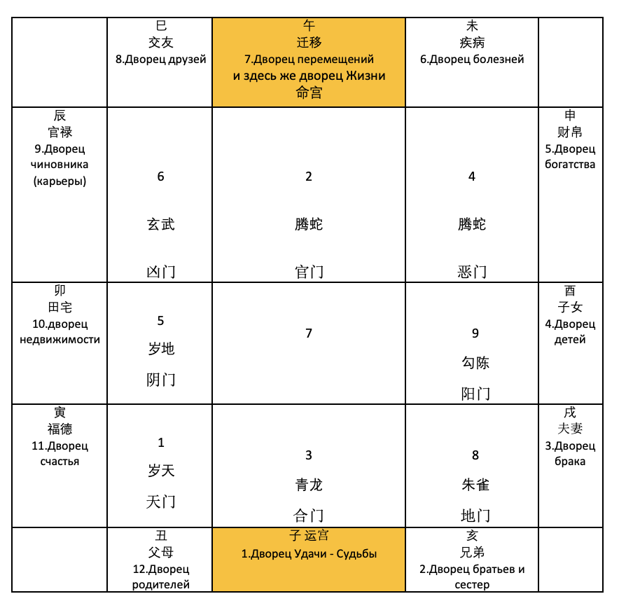 ЗВ часа оказывается в 子. Таким образом, дворец ЗВ 子 будет Дворцом Удачи 运宫. Остальные дворцы расставляем против часовой стрелки: