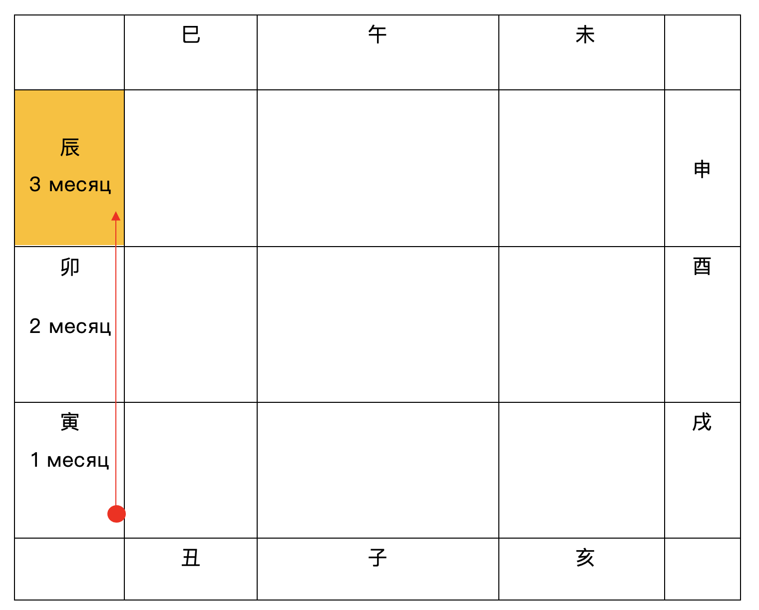 Начинаем считать с дворца ЗВ 寅 по часовой стрелке до числа 3 (т.к. 3-ий месяц рождения).