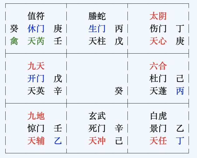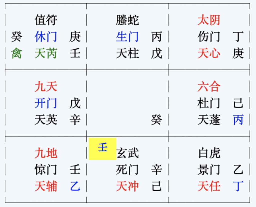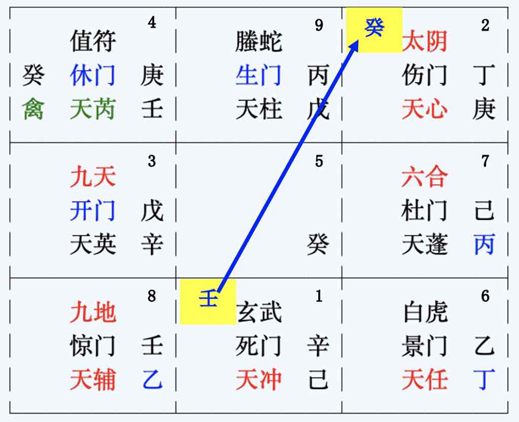 5. Расклад имеет пробежку Ян Дунь, значит, стволы пойдут шагом Юя вперед. Следовательно, Скрытый ствол 癸 пойдет во 2 дворец Кунь:
