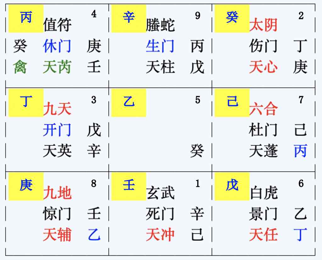 - Расставляются 戊己庚辛壬癸丁丙乙 по полетом (т.е. шагом Юя) вперед или назад в зависимости от направления пробежки текущего расклада цимэнь:
